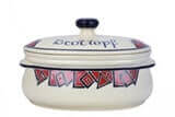 Eine Kreation aus dem Westerwald ist dieser kleine ovale Brottopf mit Bemalung in rot und schwarz.