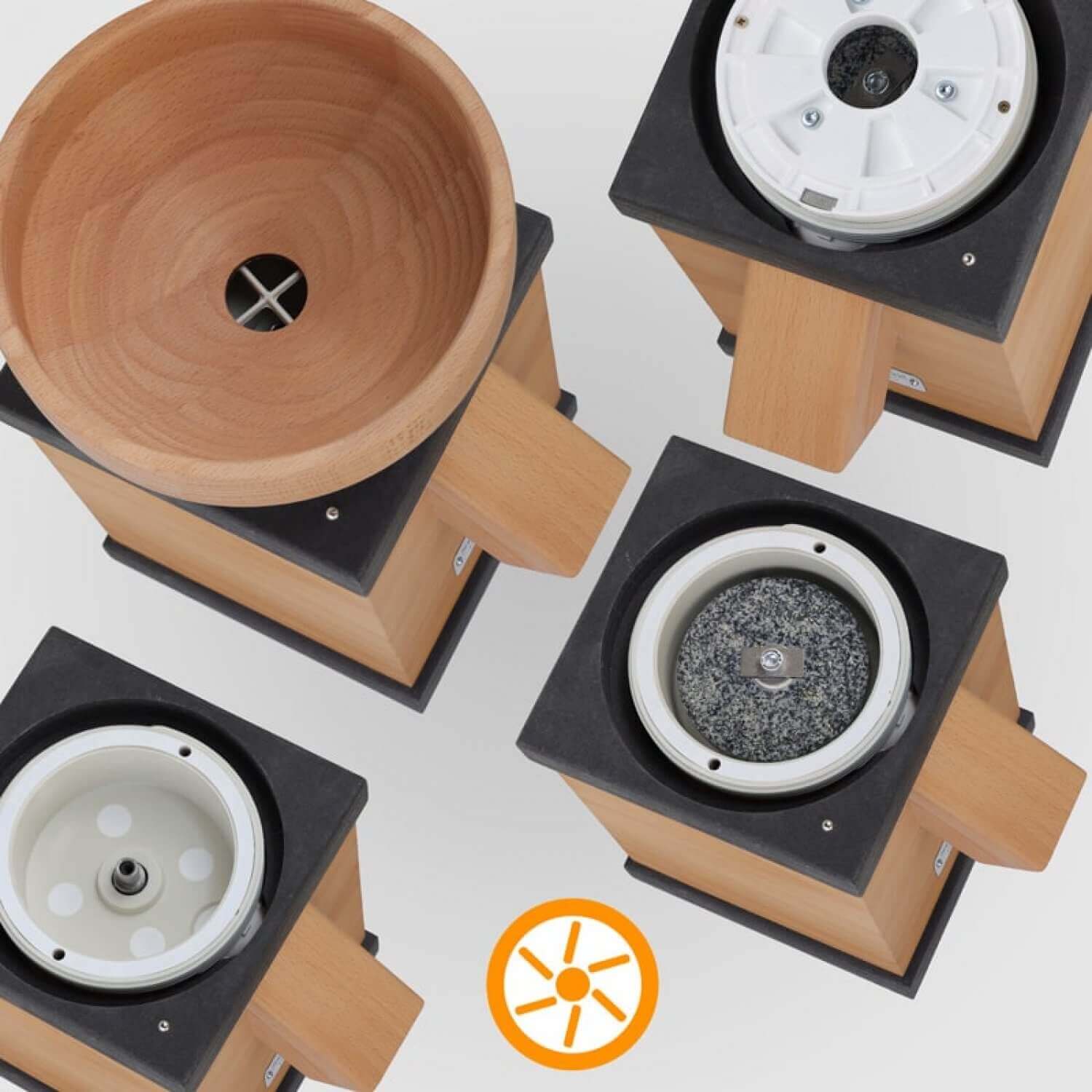 Der Mühlenkorpus ist aus Buche Multiplex gefertigt. Dieses Plattenmaterial besteht aus mehreren kreuzweise verleimten Holzschichten und ist dadurch sehr widerstandsfähig gegen Reißen und Verformung.