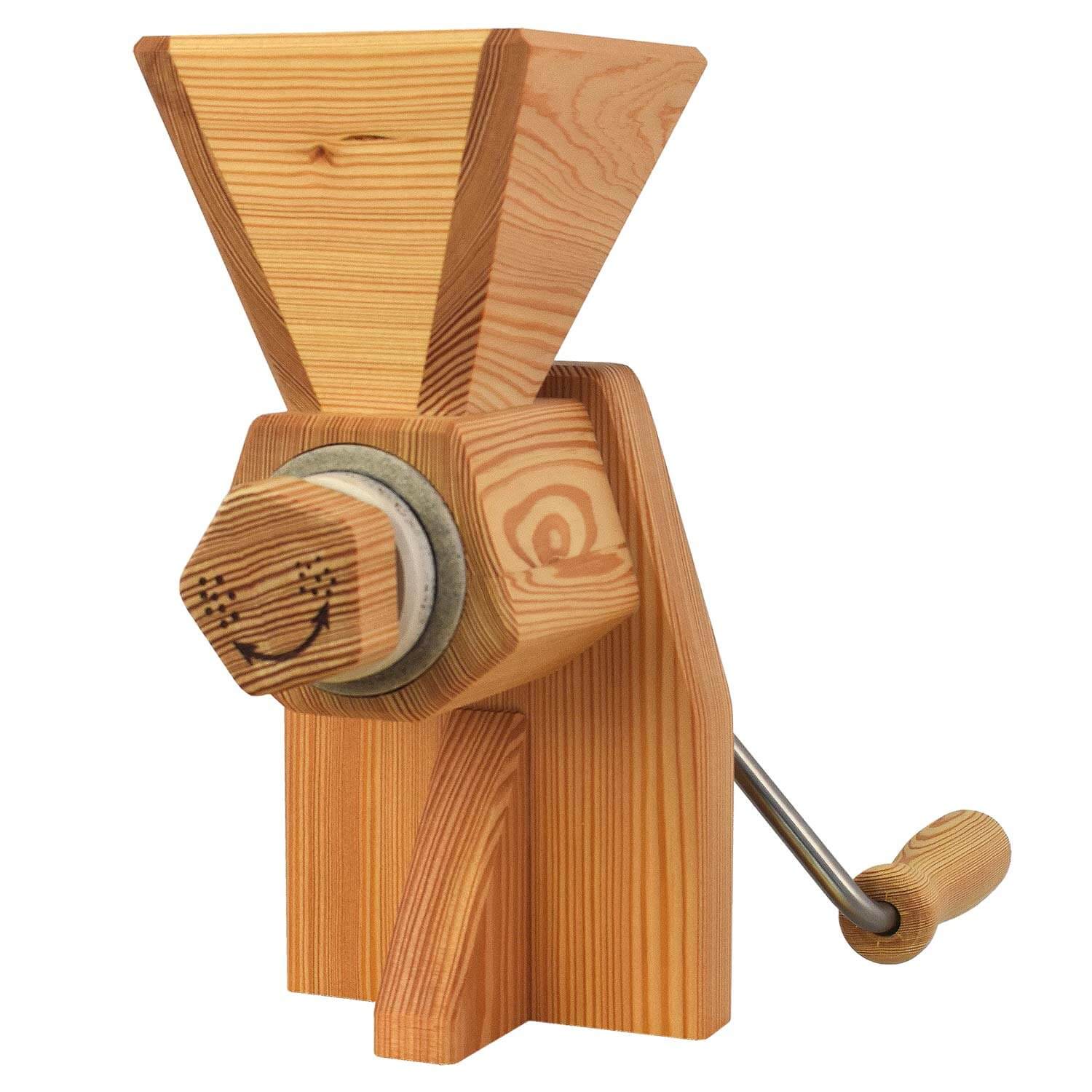 ist aus einheimischem Lärchenholz und mit natürlichem Bienenwachsbalsam behandelt. Die Kurbel ist kugelgelagert und somit äußerst leichtgängig.Die Mahlsteine