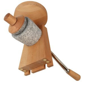 Auf der Steinabdeckung aus Buchenholz ist eine punktierte Skala angebracht. Am Knauf bzw. Drehknopf, den man zur Einstellung des Feinheitsgrades einfach dreht, ist ein Punkt zur Orientierung aufgedruckt. Durch weiteres Drehen des Knaufes in Richtung grob kann man auch ganz leicht und einfach den inneren Mahlstein von der Welle lösen, um die Steine im Bedarfsfall zu reinigen.