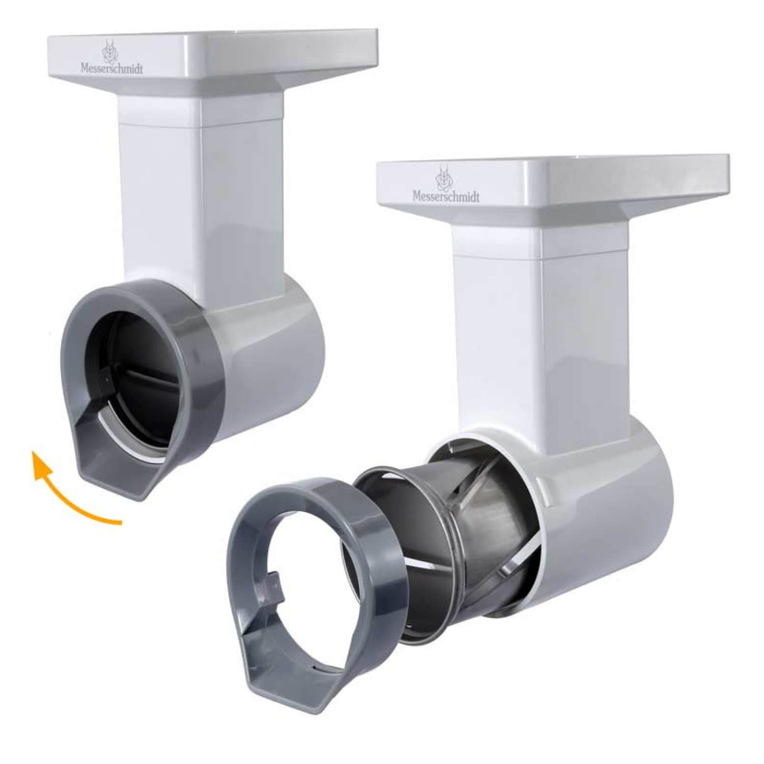 Der Messerschmidt Gemüseschneider Raffelvorsatz CLASSIC ist auch unter den Bezeichnungen, Rohkostvorsatz, Gemüseraffel oder Schnitzelwerk bekannt.