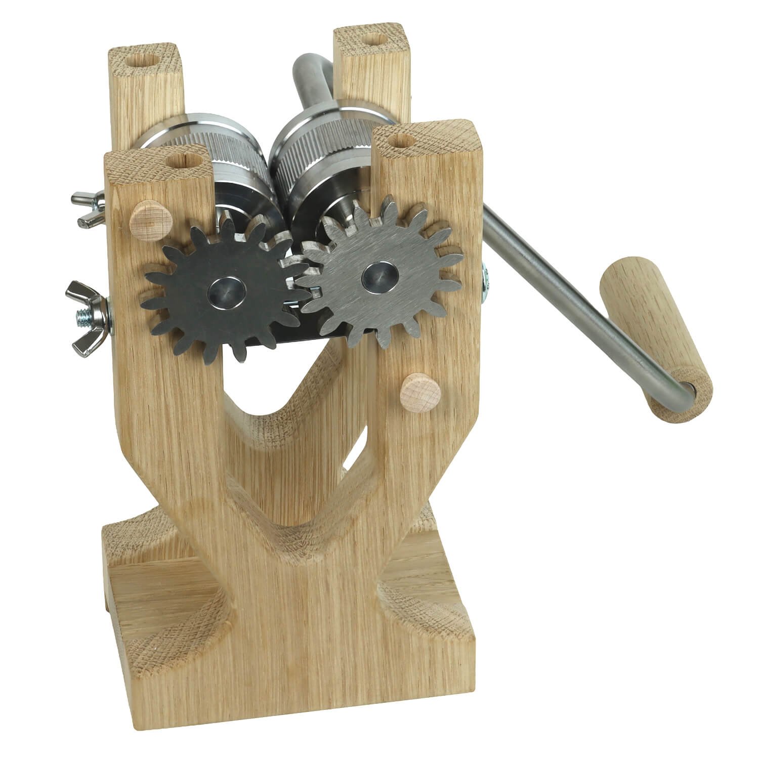 Damit sich auch die nicht direkt durch die Kurbel angetriebene Walze immer mittdreht, sind bei dieser Flockenquetsche Zahnräder an den Walzen angebracht.